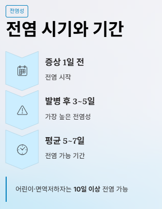 | 전염 기간 | 증상 1일 전 ~ 증상 후 3~5일 이상 |