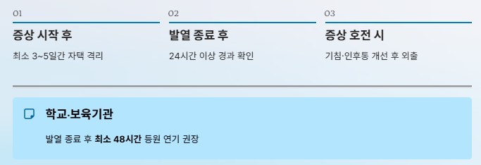 | 격리 권고 기간 | 증상 시작 후 최소 3~5일 + 발열 소실 후 24시간 |