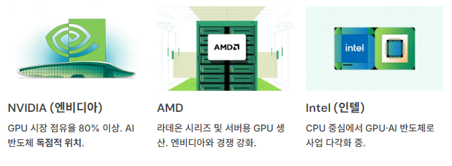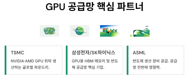각 기업은 GPU 기술력과 공급망을 기반으로 글로벌 반도체 생태계를 주도하고 있습니다.
