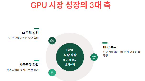 AI 모델 고도화, 고성능 컴퓨팅(HPC) 수요 증가, 자율주행 기술 확산이 GPU 시장 성장의 3대 축입니다.