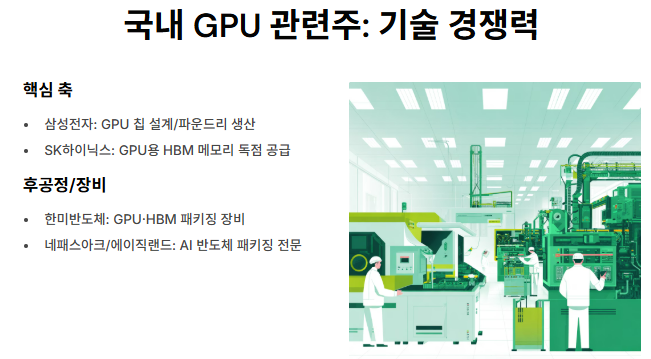 국내 GPU 관련주는 글로벌 기업과의 협력 및 반도체 공급망 확대로 주목받고 있습니다. AI 반도체·HBM 메모리·패키징·장비 분야 중심으로 성장세가 이어지고 있습니다.