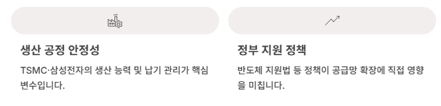 - 생산공정·파운드리 안정성 : TSMC·삼성전자의 생산능력과 납기 관리가 핵심 변수입니다.