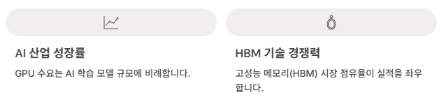 - HBM 기술 경쟁력 : SK하이닉스·삼성전자의 고성능 메모리 시장 점유율이 실적을 좌우합니다.