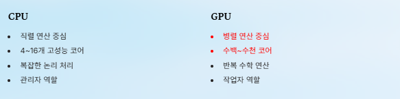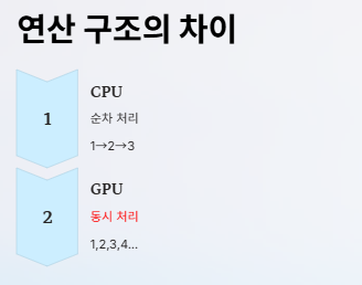 CPU는 직렬(Sequential) 연산 중심, GPU는 병렬(Parallel) 연산 중심입니다.