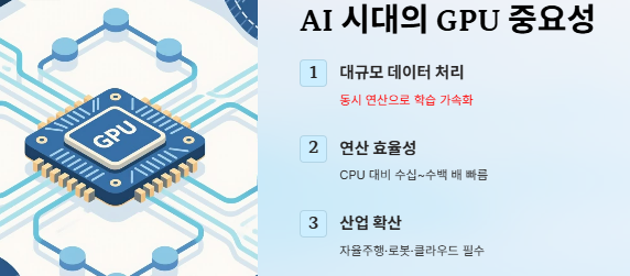 GPU는 그래픽 처리용 장치로 출발했지만, 현재는 AI·데이터센터·자율주행·메타버스 등 고성능 연산 분야 전반에 활용되고 있습니다.