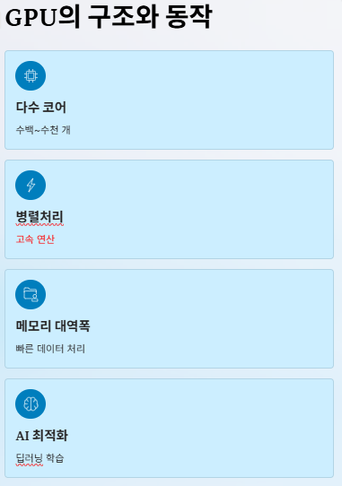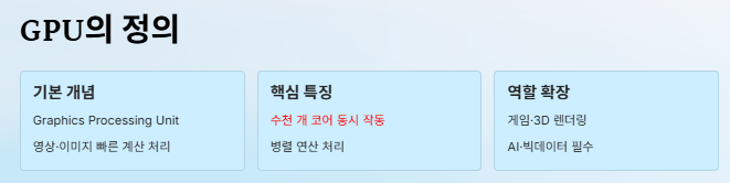 이처럼 GPU는 CPU가 처리하기 힘든 대규모 병렬 작업을 보완하며, 특히 AI·딥러닝·데이터센터 분야에서 핵심 장치로 자리 잡았습니다.