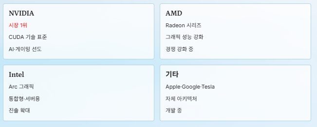 현재 GPU 시장은 몇몇 글로벌 기업이 주도하고 있습니다.