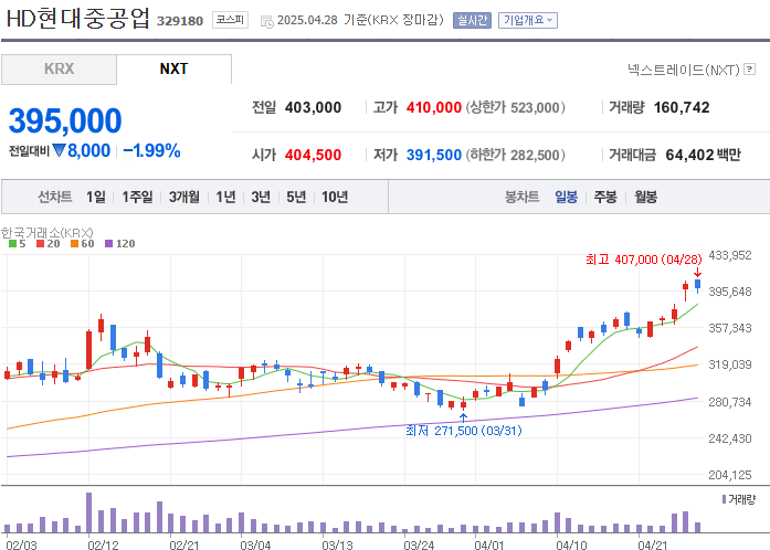 HD현대중공업의 주가는 최근 1년 동안 매우 가파른 상승세를 보였습니다. 2024년 4월 28일 기준 주가는 395,000원을 기록하고 있으며, 이는 52주 최고가(407,000원)에 거의 근접한 수준입니다.