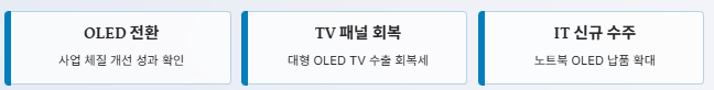 특히 OLED TV용 패널이 유럽과 북미 시장에서 회복세를 보이고 있고, 애플·HP 등 글로벌 고객사 대상 노트북용 OLED 납품이 확대될 것으로 전망됩니다.