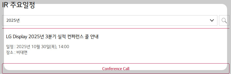 (아래는 LG디스플레이 공식 IR홈페이지에 게시된 2025년 3분기 실적발표 및 컨퍼런스콜 안내 페이지 입니다.)