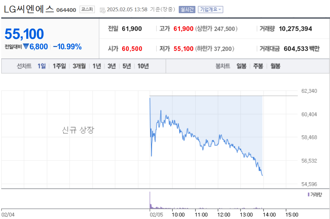 LG CNS는 상장 첫날 공모가 대비 약 5.7% 이상 하락한 5만 8,400원 이하로 형성되고 최저가 5만 4,900원까지도 하락하였습니다. 하지만 주가가 하락했다고 해서 기업의 미래 가치가 낮아지는 것은 아닙니다. 오히려 장기적인 관점에서 주가 상승 가능성이 높다고 평가됩니다.