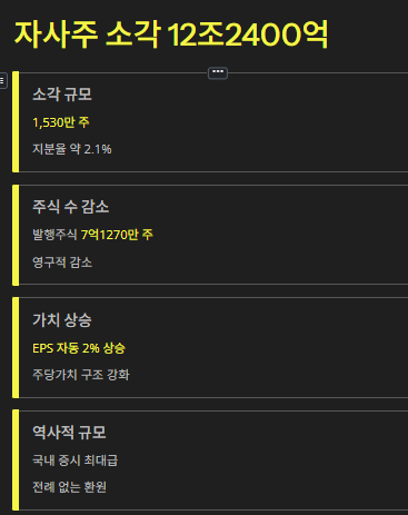 특히 이번 소각 규모는 국내 증시에서도 전례를 찾기 힘든 수준입니다. 지난해 국내 상장사 전체 자사주 소각 규모의 절반이 넘는 금액을 단일 기업이 한 번에 집행하는 것이기 때문에, 한국 증시 역사상 가장 강력한 주주환원 정책 중 하나로 평가됩니다.